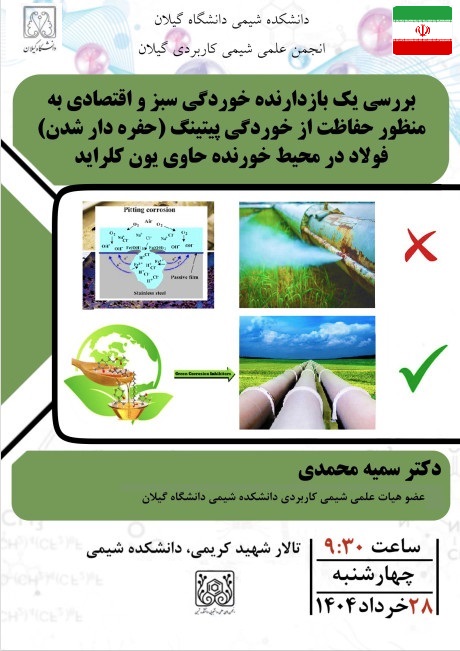 به اطلاع اساتید محترم و دانشجویان عزیز می رساند، سمینار علمی تحت عنوان "بررسی یک بازدارنده خوردگی سبز و اقتصادی به منظور حفاظت از خوردگی پیتینگ (حفره دار شدن) فولاد در محیط خورنده حاوی یون کلراید" با ارایه دکتر سمیه محمدی عضو هیات علمی گروه شیمی کاربردی، در روز چهارشنبه 28 خرداد 1404، ساعت 9:30 در دانشکده شیمی و علوم پایه ( تالار شهید کریمی) برگزار می گردد. لذا، از علاقمندان دعوت می شود در سمینار شرکت فرمایند. با تشکر
