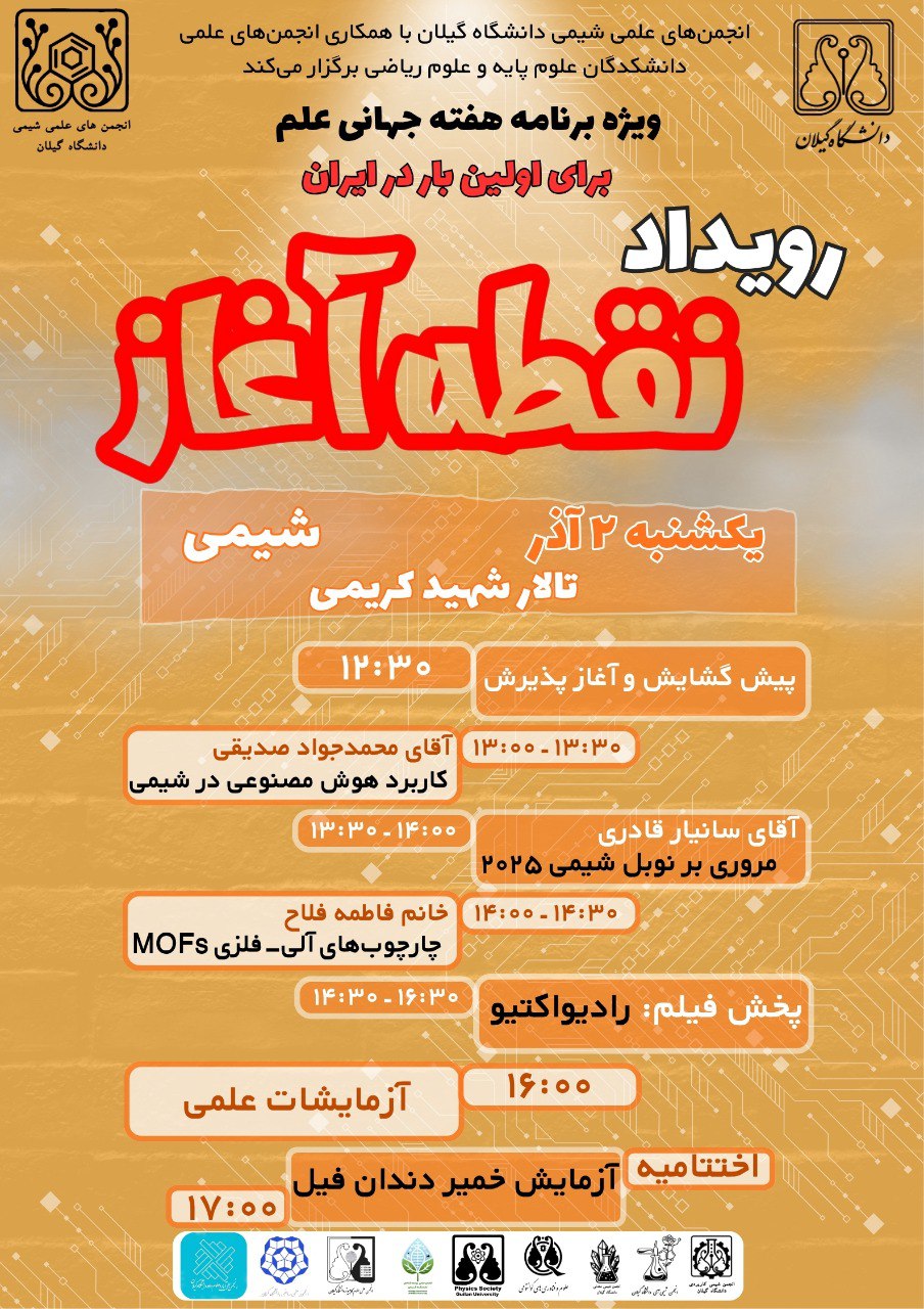 به مناسبت فرارسیدن هفته جهانی علم و در راستای گسترش فعالیتهای علمی-ترویجی در دانشکده شیمی، بدینوسیله از تمام اعضای هیات علمی و دانشجویان برای حضور در ویژهبرنامه انجمنهای علمی دانشکده شیمی دعوت بهعمل میآید. این برنامه با هدف ارتقای سطح آگاهی علمی، ترویج پژوهشهای نوین و ایجاد فضای تعاملی میان اساتید و دانشجویان برگزار میگردد. زمان: یکشنبه دوم آذر- ساعت 13 تالار شهید کریمی