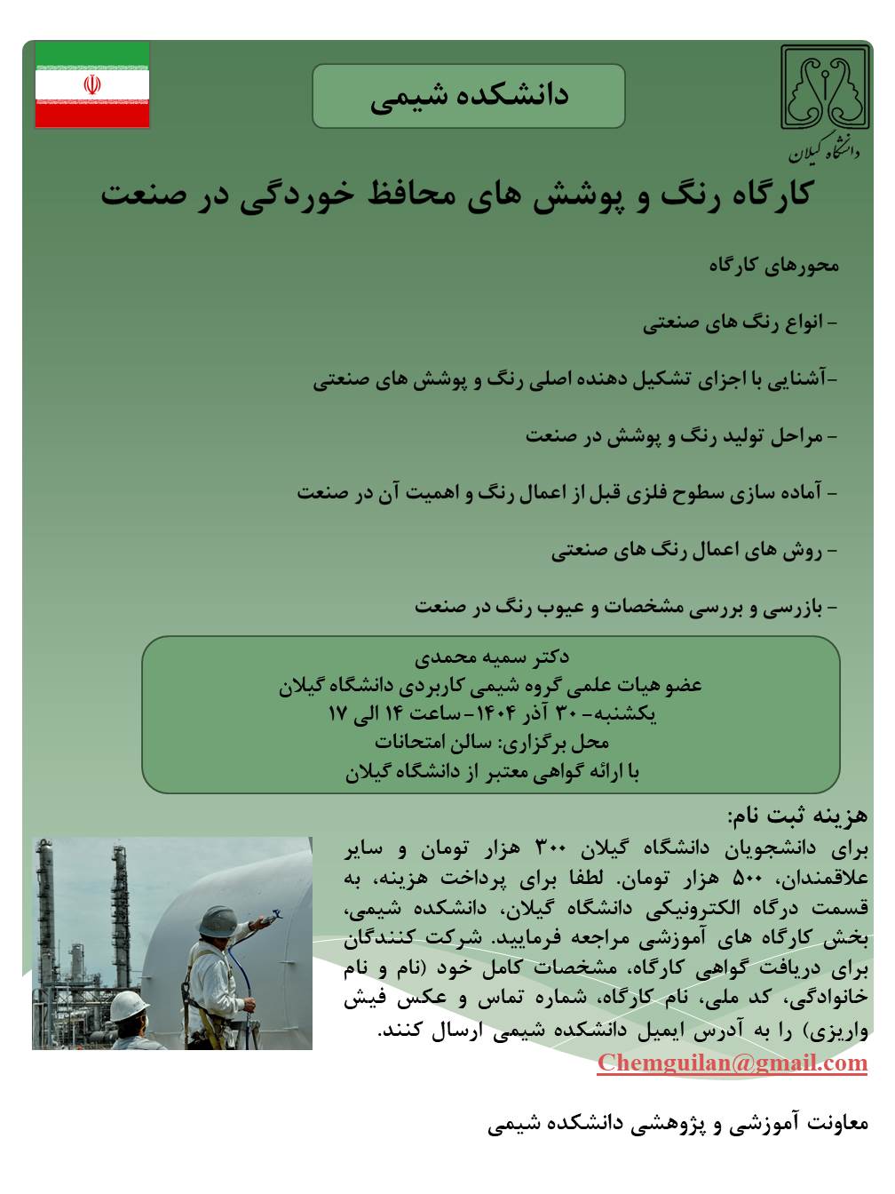 بدین وسیله به اطلاع کلیه دانشجویان و علاقمندان می رساند، کارگاه آموزشی "رنگ و پوشش های محافظ خوردگی در صنعت" با هدف آشنایی با مبانی علمی، کاربردهای صنعتی و آخرین دستاوردهای این حوزه برگزار می گردد.